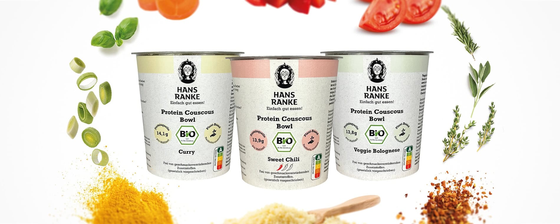 Die Protein-Couscous-Bowls von Hans Ranke zeichnen sich durch ihre natürlichen Zutaten und den Verzicht auf künstliche Zusätze aus. Mit nur 295 kcal pro Portion sorgen sie für ein langanhaltendes Sättigungsgefühl von bis zu vier Stunden, ohne ein Völlegefühl zu hinterlassen. Erhältlich in den Geschmacksrichtungen Curry, Sweet Chili und Veggie Bolognese, bieten sie für jeden Geschmack das Richtige.